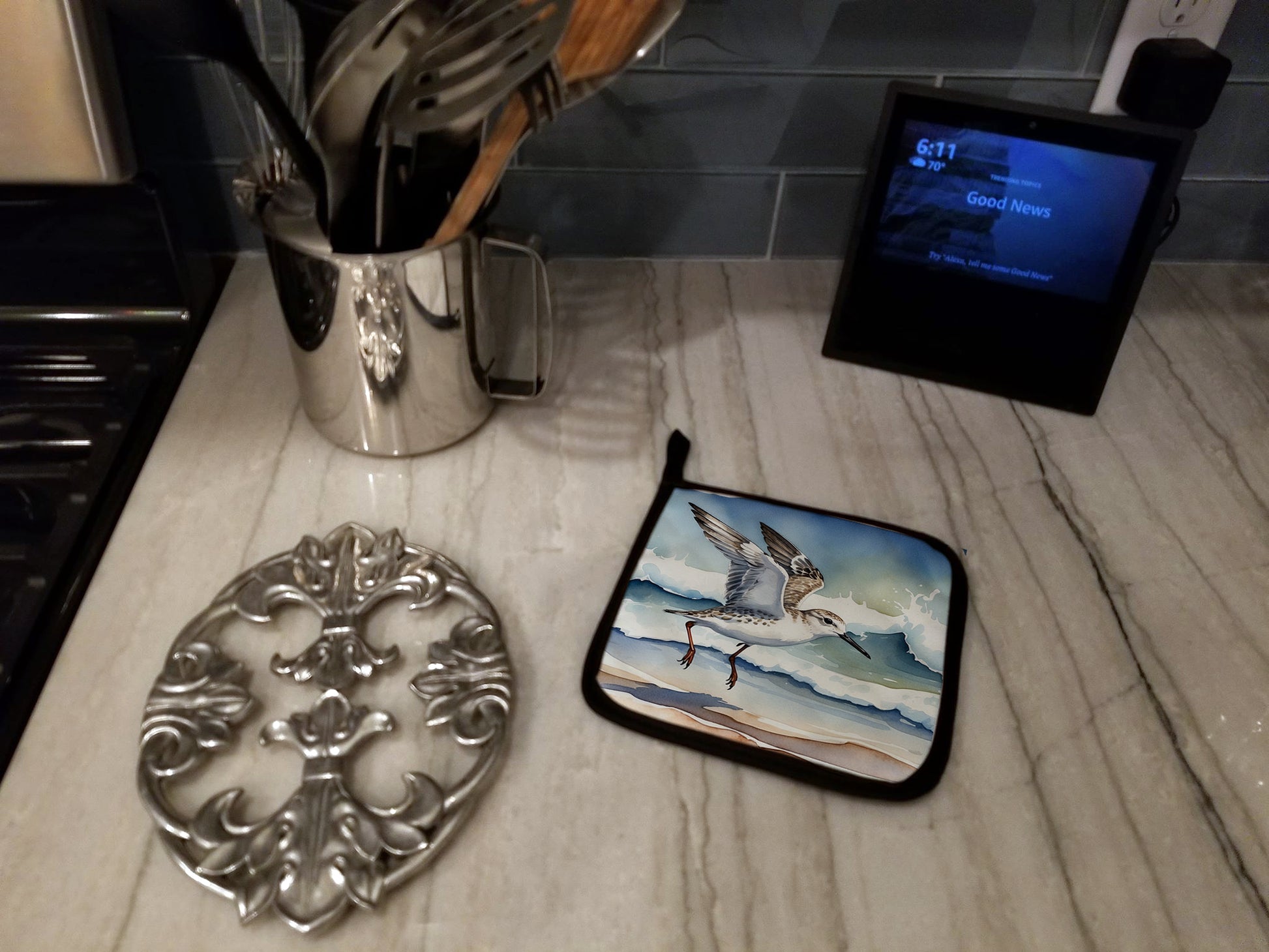 Pair of Pot Holders featuring breed specific Sanderling artwork. A Pair of Pot Holders to match your kitchen decor. Made in the USA these are thick and functional. Full color artwork decorates the front polyester fabric of the hot pad and accented by a black trim. Use these at as a trivet for your Thanksgiving or Christmas tablescape. Filled with insulated fabric and quilted for durability. These colorful pot holders will make a great gift for your favorite home cook or executive chef. Each pot holder measures approximately 7 1/2 inches by 7 1/2 inches. A hanging tab is included.