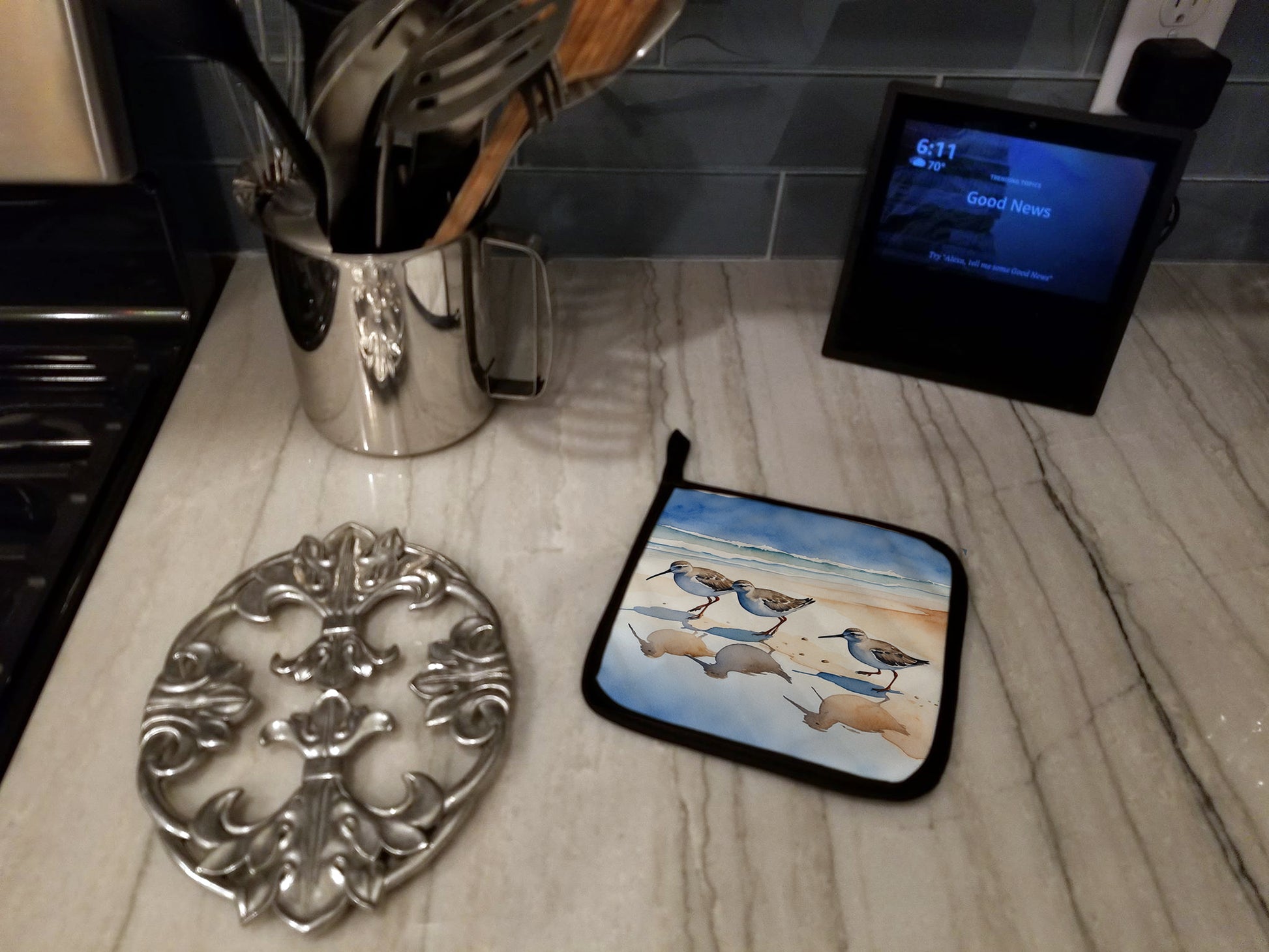 Pair of Pot Holders featuring breed specific Sandpipers artwork. A Pair of Pot Holders to match your kitchen decor. Made in the USA these are thick and functional. Full color artwork decorates the front polyester fabric of the hot pad and accented by a black trim. Use these at as a trivet for your Thanksgiving or Christmas tablescape. Filled with insulated fabric and quilted for durability. These colorful pot holders will make a great gift for your favorite home cook or executive chef. Each pot holder measures approximately 7 1/2 inches by 7 1/2 inches. A hanging tab is included.