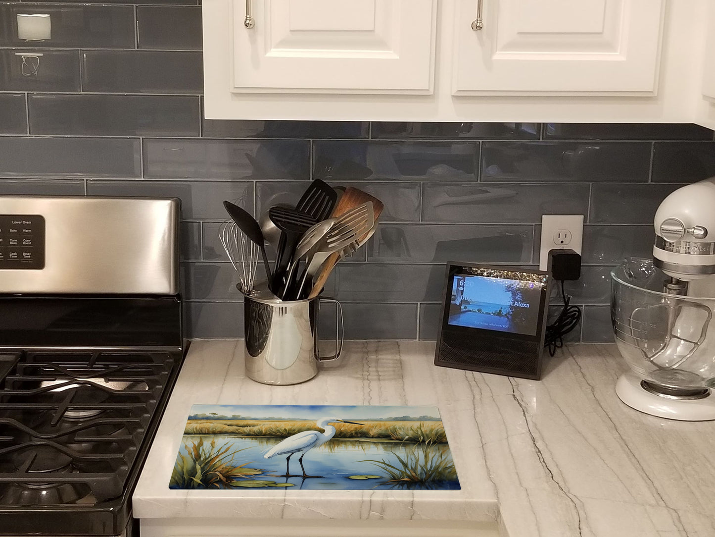 Glass Cutting Board featuring breed specific Snowy Egret artwork. Introduce your kitchen to the vibrant, large Decorative Glass Cutting Board from Caroline's Treasures. Crafted from resilient tempered glass, this board is not only a utilitarian necessity but also a colorful art piece. With its generous dimensions of 15 inches in height and 12 inches in length, it offers ample space for all your cutting needs. Every piece showcases captivating artwork from distinguished artists, bringing an aesthetic edge to your kitchen. Beyond its attractive design, this cutting board ensures your countertop stays pristine and unscathed, owing to its heat-resistant properties. Engineered with user convenience in mind, it features non-skid feet for stability, and rounded corners for additional safety. Its robust construction renders it virtually unbreakable, guaranteeing longevity. The board comes with protective feet bumpers, maintaining its position during use. This product is recommended to be hand washed only. Proudly printed and assembled in the United States, this cutting board exemplifies superior craftsmanship. With Caroline's Treasures' Decorative Glass Cutting Board, you're investing in a blend of functionality and artistic flair.