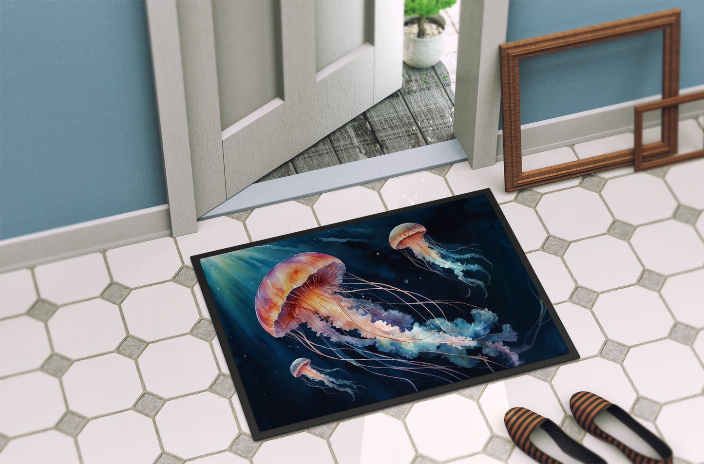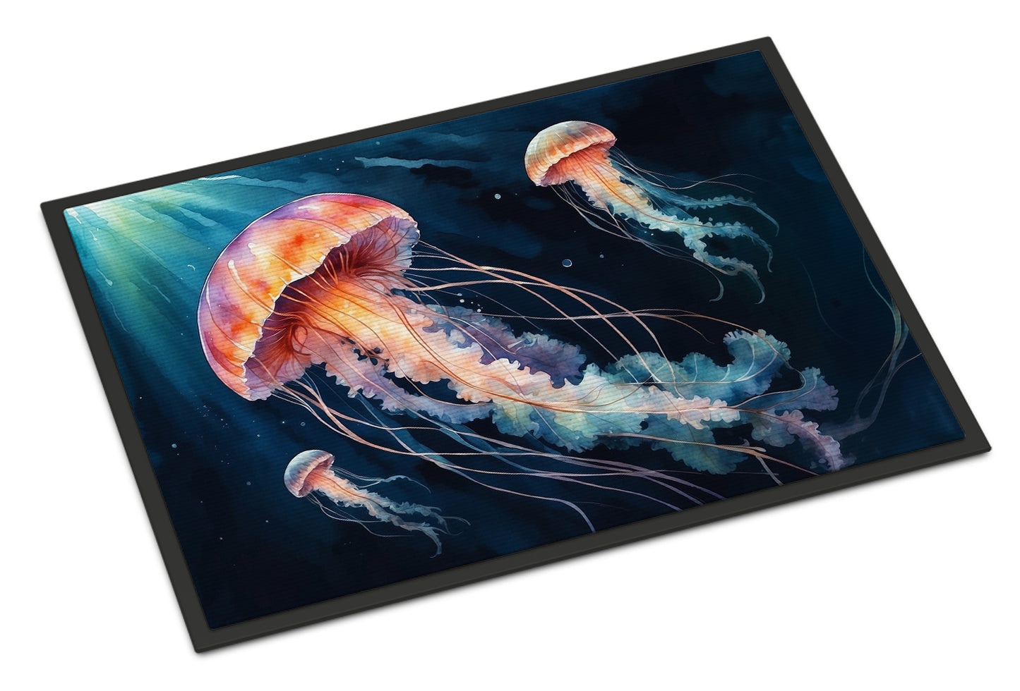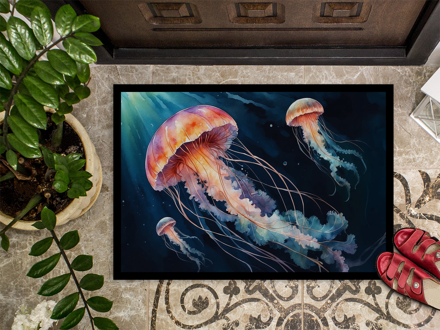 Doormat featuring breed specific Jellyfish artwork. Welcome your guests in style with our Artwork Door Mat, designed to withstand almost any weather condition. This mat, measuring approximately 24 by 36 inches, is held together by durable black binding tape. Its top layer, composed of polyester felt, is dyed with the eye-catching image you see on the mat. A few layers below provide the mat with stability, while its rubber bottom is stamped to help prevent slipping and ensures safety. Our mat works wonderfully as both an indoor or outdoor door mat. For cleaning, simply hose it off with water or use a power washer - no need for any cleaner that produces suds. Avoid scrubbing with a brush, instead, opt for the vacuum on floor setting. Designed manufactured and printed in the USA, this mat is a perfect addition to your porch, outdoor kitchen, entryway, or any indoor space. Its unique design makes it a charming decorative rug that greets your guests and adds a stylish touch to your home decor.