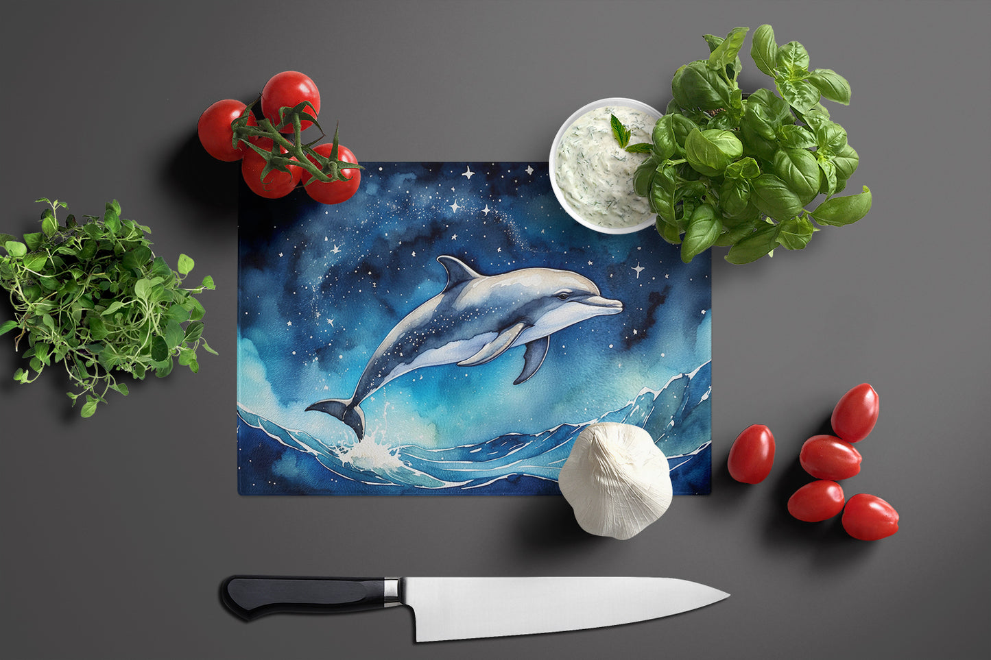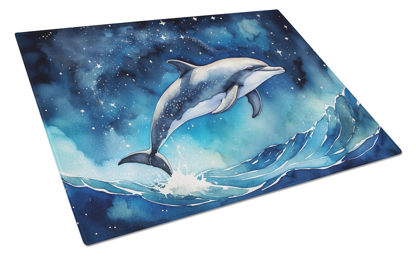 Glass Cutting Board featuring breed specific Dolphin artwork. Introduce your kitchen to the vibrant, large Decorative Glass Cutting Board from Caroline's Treasures. Crafted from resilient tempered glass, this board is not only a utilitarian necessity but also a colorful art piece. With its generous dimensions of 15 inches in height and 12 inches in length, it offers ample space for all your cutting needs. Every piece showcases captivating artwork from distinguished artists, bringing an aesthetic edge to your kitchen. Beyond its attractive design, this cutting board ensures your countertop stays pristine and unscathed, owing to its heat-resistant properties. Engineered with user convenience in mind, it features non-skid feet for stability, and rounded corners for additional safety. Its robust construction renders it virtually unbreakable, guaranteeing longevity. The board comes with protective feet bumpers, maintaining its position during use. This product is recommended to be hand washed only. Proudly printed and assembled in the United States, this cutting board exemplifies superior craftsmanship. With Caroline's Treasures' Decorative Glass Cutting Board, you're investing in a blend of functionality and artistic flair.