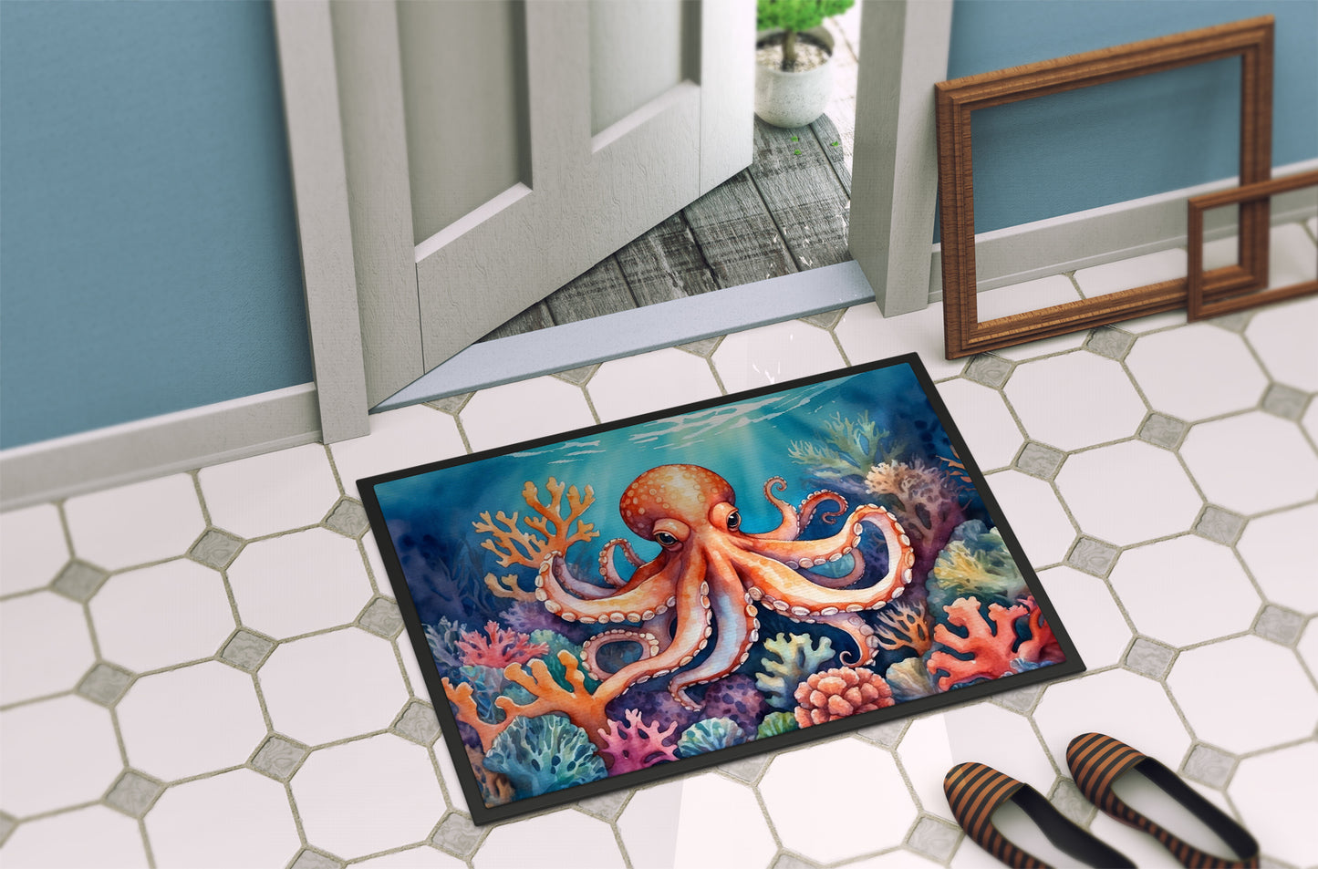 Doormat featuring breed specific Octopus artwork. Welcome your guests in style with our Artwork Door Mat, designed to withstand almost any weather condition. This mat, measuring approximately 24 by 36 inches, is held together by durable black binding tape. Its top layer, composed of polyester felt, is dyed with the eye-catching image you see on the mat. A few layers below provide the mat with stability, while its rubber bottom is stamped to help prevent slipping and ensures safety. Our mat works wonderfully as both an indoor or outdoor door mat. For cleaning, simply hose it off with water or use a power washer - no need for any cleaner that produces suds. Avoid scrubbing with a brush, instead, opt for the vacuum on floor setting. Designed manufactured and printed in the USA, this mat is a perfect addition to your porch, outdoor kitchen, entryway, or any indoor space. Its unique design makes it a charming decorative rug that greets your guests and adds a stylish touch to your home decor.
