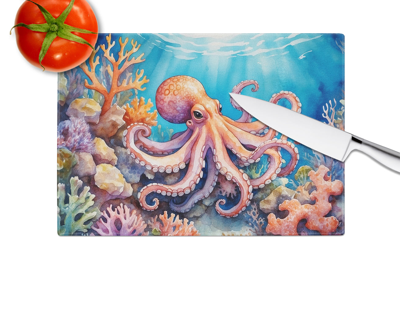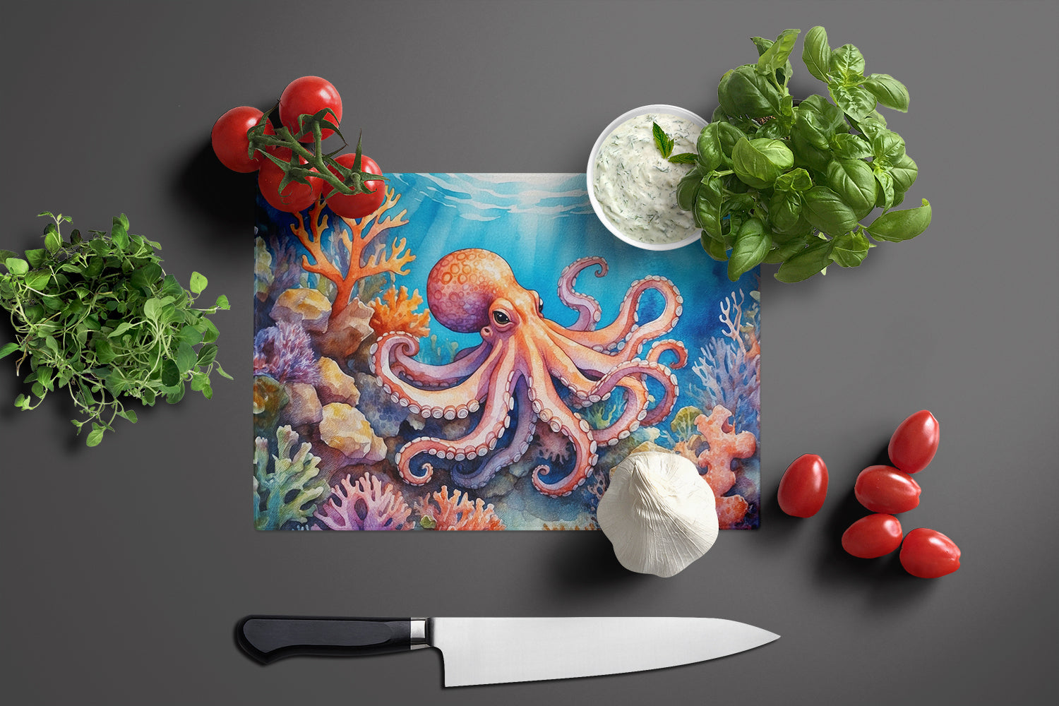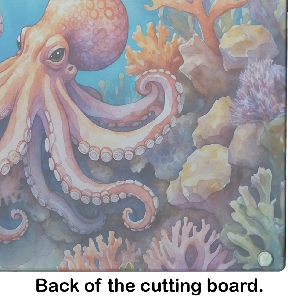 Glass Cutting Board featuring breed specific Octopus artwork. Introduce your kitchen to the vibrant, large Decorative Glass Cutting Board from Caroline's Treasures. Crafted from resilient tempered glass, this board is not only a utilitarian necessity but also a colorful art piece. With its generous dimensions of 15 inches in height and 12 inches in length, it offers ample space for all your cutting needs. Every piece showcases captivating artwork from distinguished artists, bringing an aesthetic edge to your kitchen. Beyond its attractive design, this cutting board ensures your countertop stays pristine and unscathed, owing to its heat-resistant properties. Engineered with user convenience in mind, it features non-skid feet for stability, and rounded corners for additional safety. Its robust construction renders it virtually unbreakable, guaranteeing longevity. The board comes with protective feet bumpers, maintaining its position during use. This product is recommended to be hand washed only. Proudly printed and assembled in the United States, this cutting board exemplifies superior craftsmanship. With Caroline's Treasures' Decorative Glass Cutting Board, you're investing in a blend of functionality and artistic flair.
