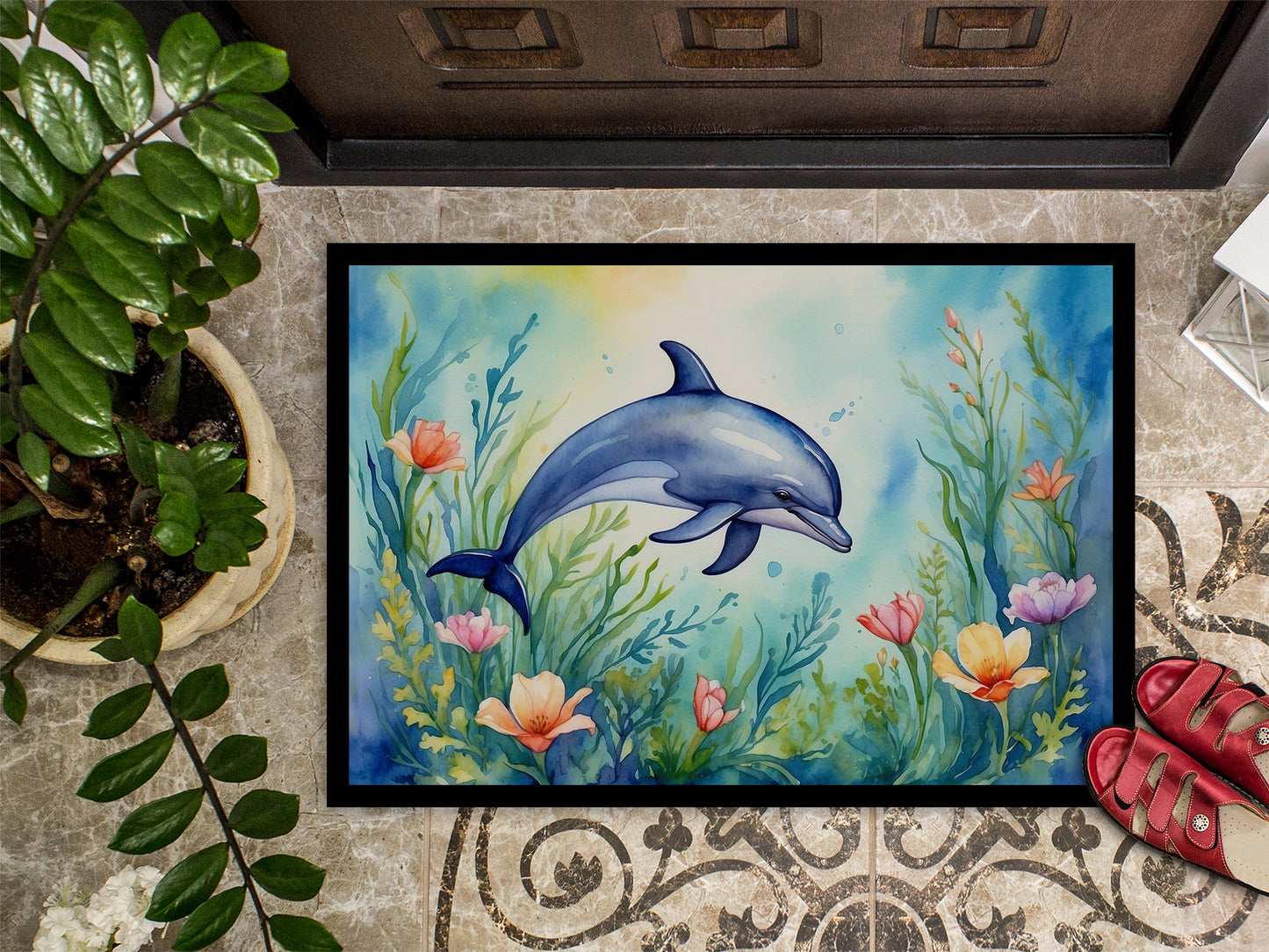 Doormat featuring breed specific Dolphin artwork. Welcome your guests in style with our Artwork Door Mat, designed to withstand almost any weather condition. This mat, measuring approximately 18 by 27 inches, is held together by durable black binding tape. Its top layer, composed of polyester felt, is dyed with the eye-catching image you see on the mat. A few layers below provide the mat with stability, while its rubber bottom is stamped to help prevent slipping and ensures safety. Our mat works wonderfully as both an indoor or outdoor door mat. For cleaning, simply hose it off with water or use a power washer - no need for any cleaner that produces suds. Avoid scrubbing with a brush, instead, opt for the vacuum on floor setting. Designed manufactured and printed in the USA, this mat is a perfect addition to your porch, outdoor kitchen, entryway, or any indoor space. Its unique design makes it a charming decorative rug that greets your guests and adds a stylish touch to your home decor.