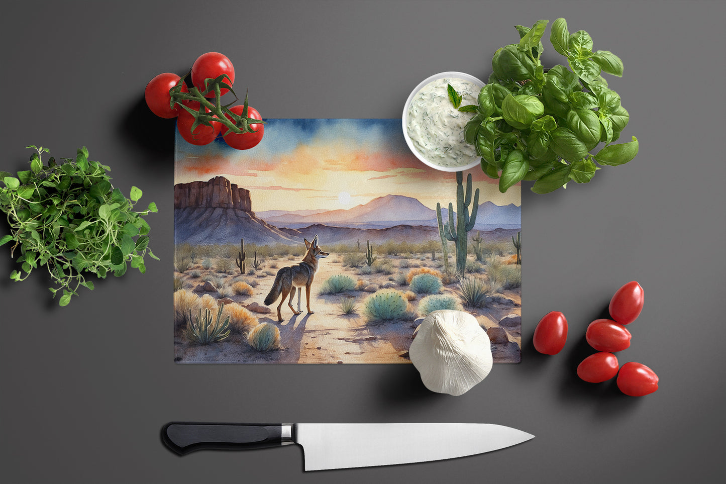Glass Cutting Board featuring breed specific Coyote artwork. Introduce your kitchen to the vibrant, large Decorative Glass Cutting Board from Caroline's Treasures. Crafted from resilient tempered glass, this board is not only a utilitarian necessity but also a colorful art piece. With its generous dimensions of 15 inches in height and 12 inches in length, it offers ample space for all your cutting needs. Every piece showcases captivating artwork from distinguished artists, bringing an aesthetic edge to your kitchen. Beyond its attractive design, this cutting board ensures your countertop stays pristine and unscathed, owing to its heat-resistant properties. Engineered with user convenience in mind, it features non-skid feet for stability, and rounded corners for additional safety. Its robust construction renders it virtually unbreakable, guaranteeing longevity. The board comes with protective feet bumpers, maintaining its position during use. This product is recommended to be hand washed only. Proudly printed and assembled in the United States, this cutting board exemplifies superior craftsmanship. With Caroline's Treasures' Decorative Glass Cutting Board, you're investing in a blend of functionality and artistic flair.