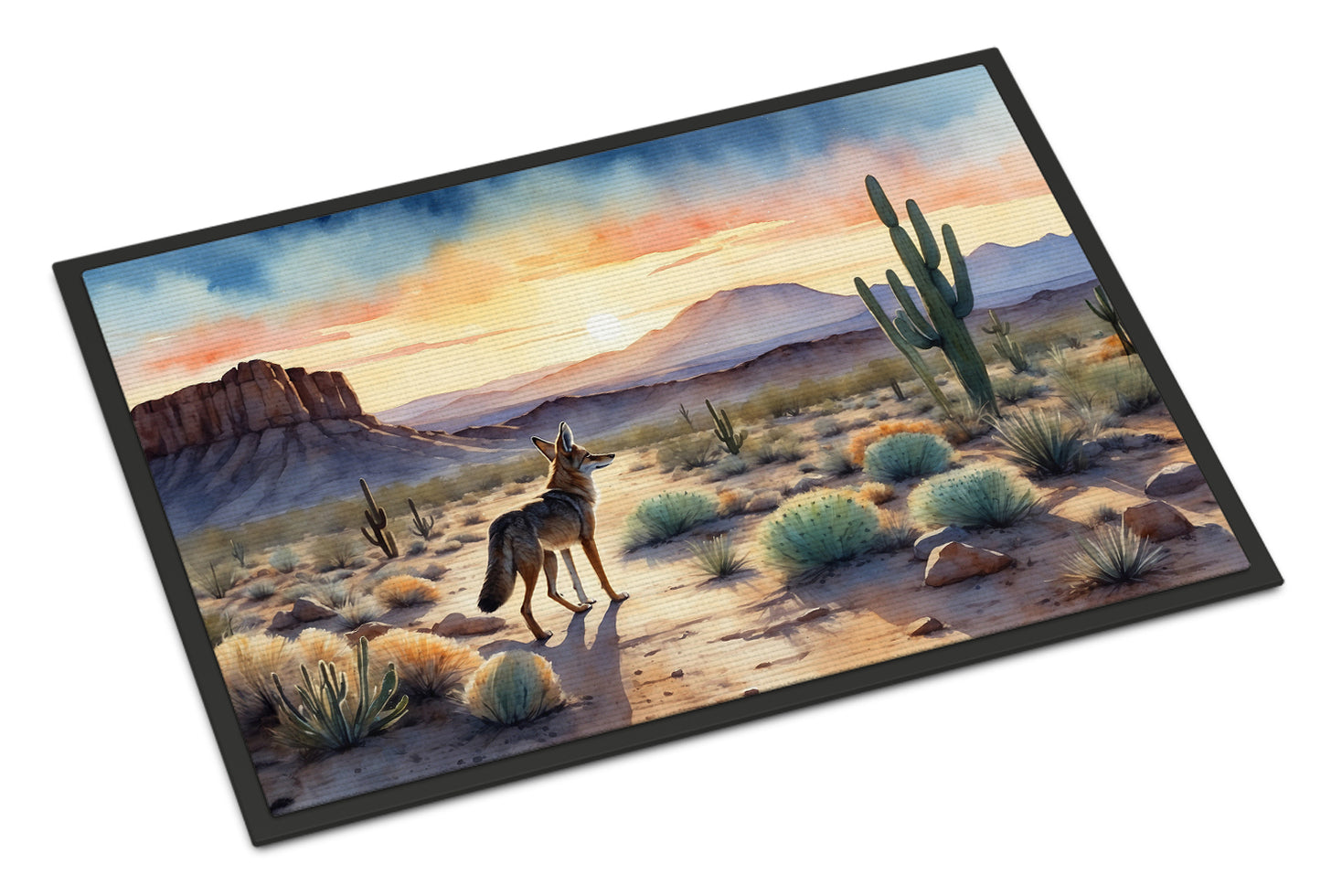 Doormat featuring breed specific Coyote artwork. Welcome your guests in style with our Artwork Door Mat, designed to withstand almost any weather condition. This mat, measuring approximately 18 by 27 inches, is held together by durable black binding tape. Its top layer, composed of polyester felt, is dyed with the eye-catching image you see on the mat. A few layers below provide the mat with stability, while its rubber bottom is stamped to help prevent slipping and ensures safety. Our mat works wonderfully as both an indoor or outdoor door mat. For cleaning, simply hose it off with water or use a power washer - no need for any cleaner that produces suds. Avoid scrubbing with a brush, instead, opt for the vacuum on floor setting. Designed manufactured and printed in the USA, this mat is a perfect addition to your porch, outdoor kitchen, entryway, or any indoor space. Its unique design makes it a charming decorative rug that greets your guests and adds a stylish touch to your home decor.