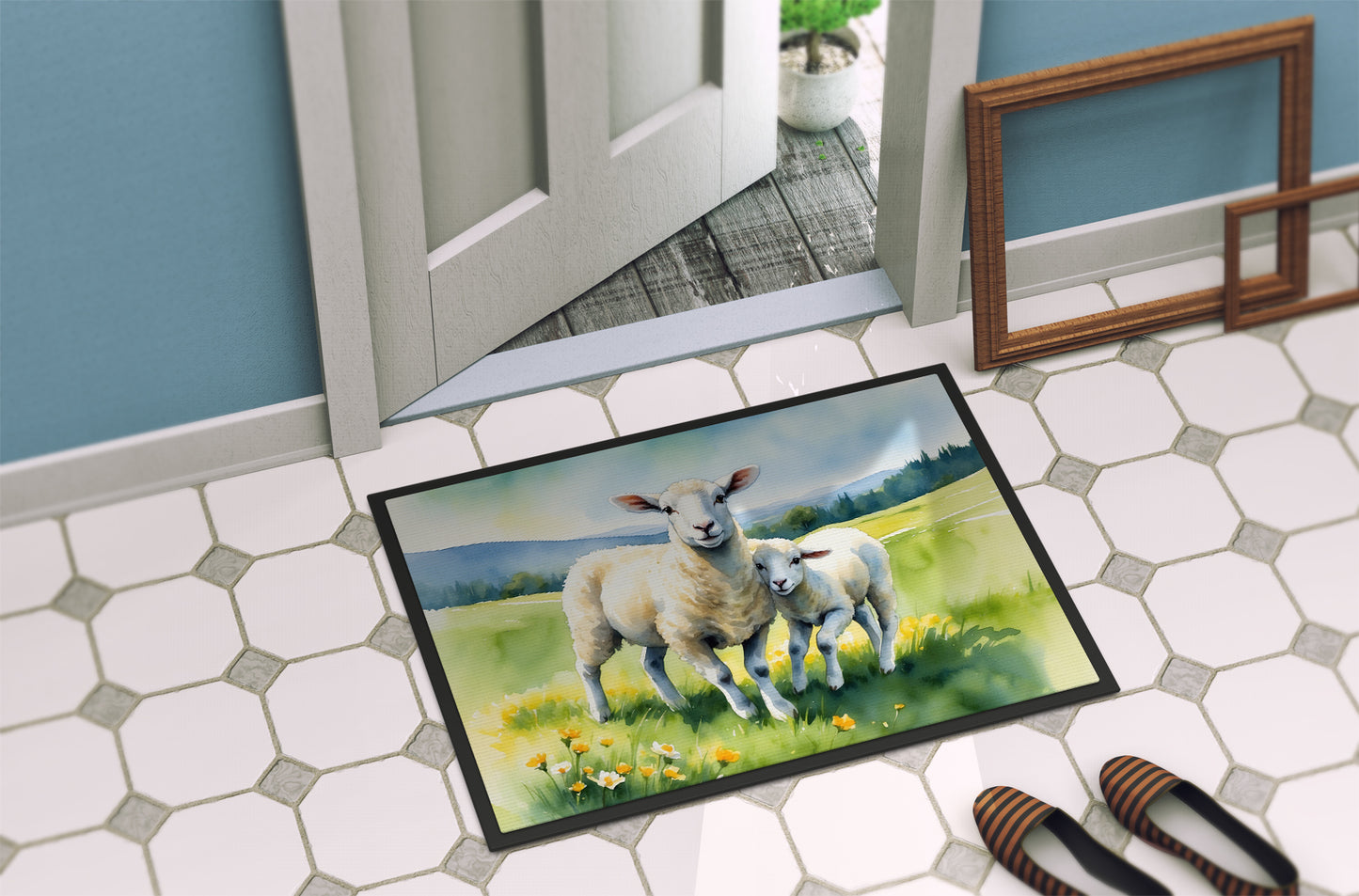 Doormat featuring breed specific Sheep artwork. Welcome your guests in style with our Artwork Door Mat, designed to withstand almost any weather condition. This mat, measuring approximately 18 by 27 inches, is held together by durable black binding tape. Its top layer, composed of polyester felt, is dyed with the eye-catching image you see on the mat. A few layers below provide the mat with stability, while its rubber bottom is stamped to help prevent slipping and ensures safety. Our mat works wonderfully as both an indoor or outdoor door mat. For cleaning, simply hose it off with water or use a power washer - no need for any cleaner that produces suds. Avoid scrubbing with a brush, instead, opt for the vacuum on floor setting. Designed manufactured and printed in the USA, this mat is a perfect addition to your porch, outdoor kitchen, entryway, or any indoor space. Its unique design makes it a charming decorative rug that greets your guests and adds a stylish touch to your home decor.